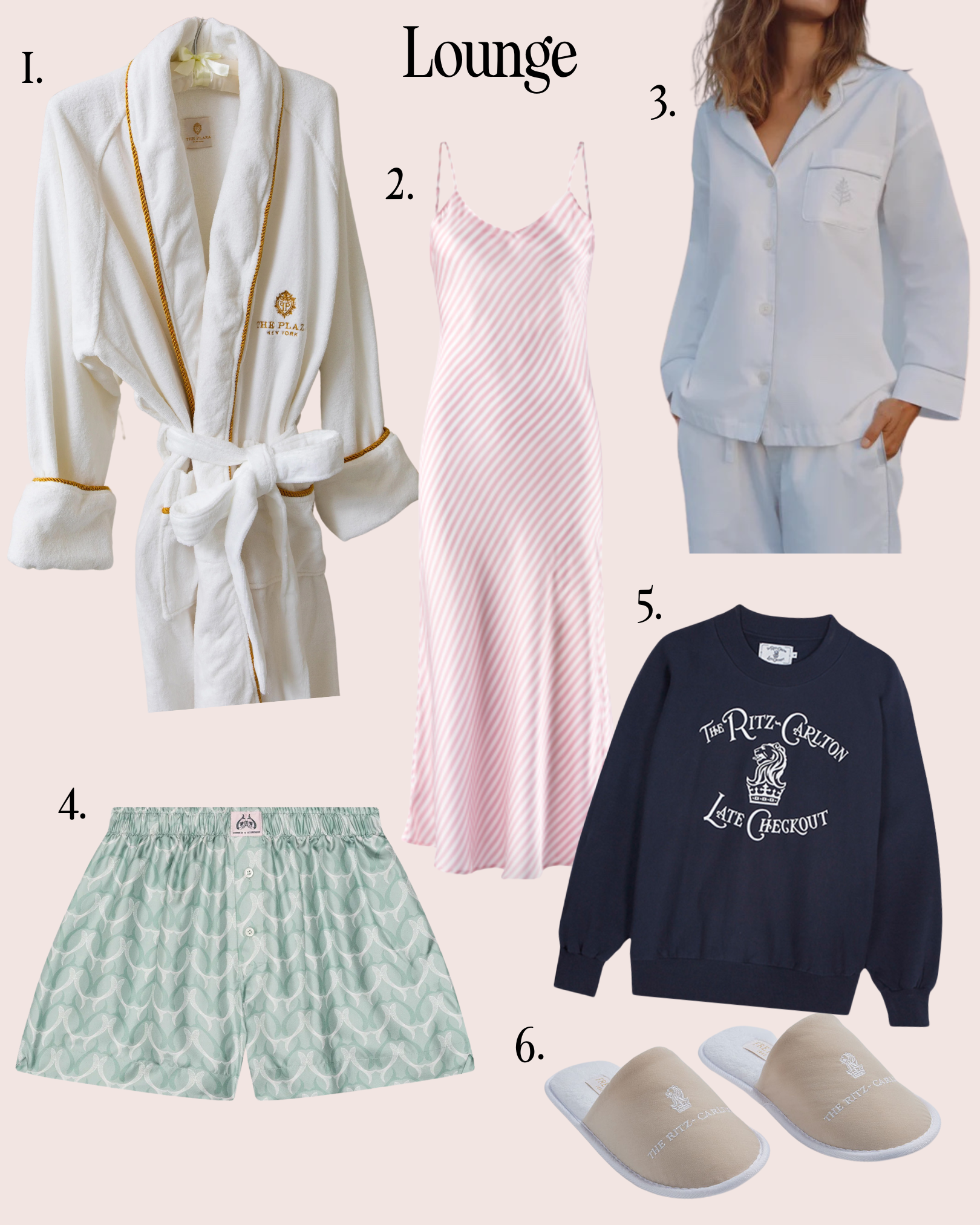 The Plaza Robe, $160. 2. The Beverly Hills Hotel Silk Long Slip Dress, $250. 3. Four Seasons Pajamas, $285 4. Comme Si x Le Sirenuse La Boxer Classica, €250 5. Ritz-Carlton Sweatshirt, $240 6. Ritz-Carlton Slippers, $25
